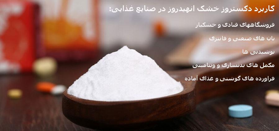 دکستروز خشک آنهیدروز به عنوان یک شیرین کننده و مکمل غذایی یکی از مهمترین مواد افزودنی در تولید مواد غذایی است. در صنعت غذایی این ماده بیشترین استفاده را دارد و اغلب در صنایع مختلف همچون صنعت داروسازی، نوشیدنی، خوراک دام و دیگر صنایع نیز به کار می رود.