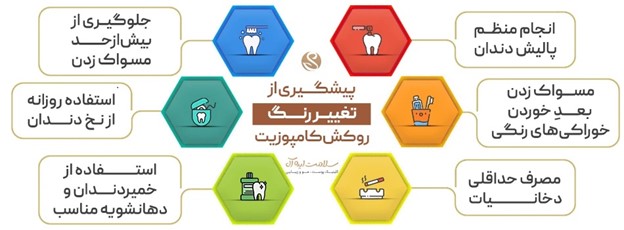 مواد غذایی نظیر قهوه، چای و نوشابههای رنگی حاوی رنگدانههایی هستند که به سطح کامپوزیت نفوذ کرده و موجب لک شدن آن میشوند. به همین دلیل، برای حفظ زیبایی کامپوزیت توصیه میشود مصرف این مواد را محدود کرده و دهان خود را پس از مصرف آنها بشویید.