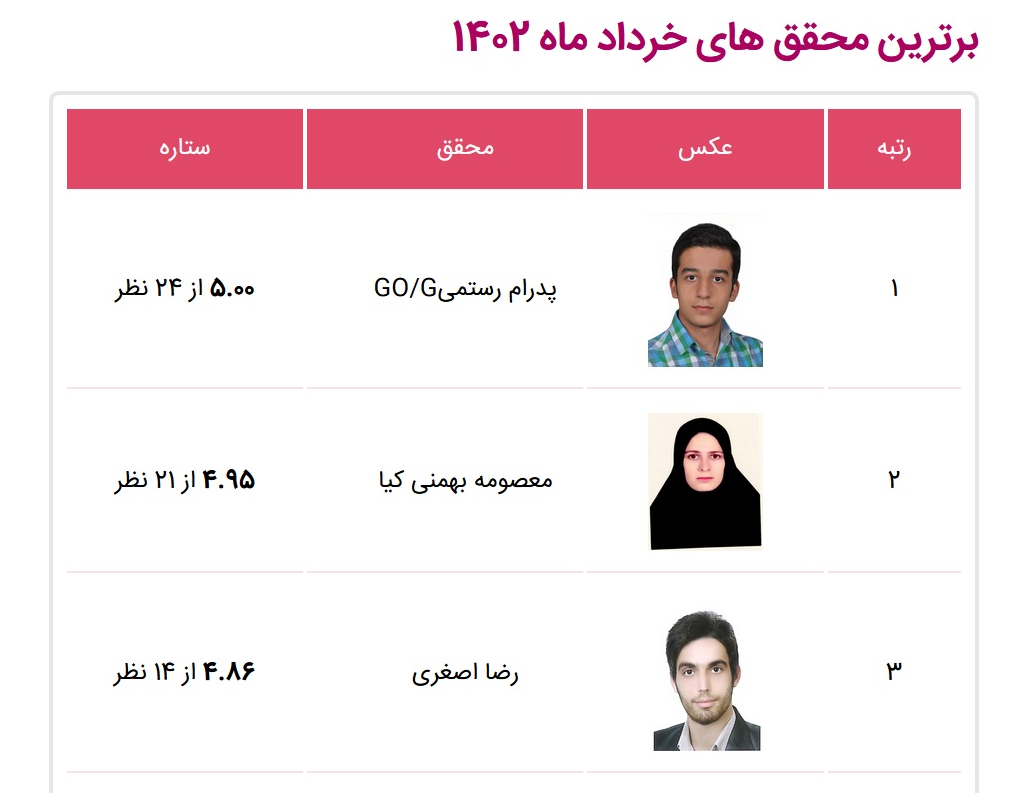 جناب آقای رضا اصغری نیز با تلاش های خود در حوزه تحقیق توانسته است در خرداد ماه رتبه سوم را به دست بیاورد. برای کسب رتبه سوم نیز نیاز است که کاربران در صورت داشتن رضایت از کار فریلنسر در وب سایت به او امتیاز و ستاره بدهند تا هم انگیزه بیشتری برای ادامه کار داشته باشد و هم متوجه شود که کارش در چه سطحی است و در صورت نیاز به بالا بردن کیفیت کار و یادگیری تخصص برای آن اقدام کند. جوایز ماهانه ایران تایپیست به محققان در پیشرفت کارشان کمک می کند.