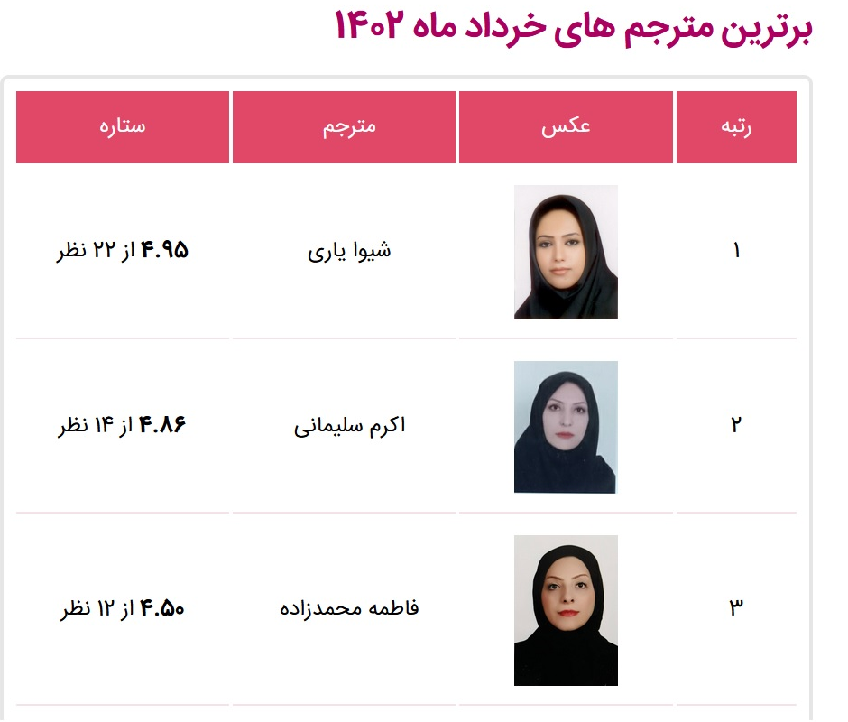 در بین این مترجمان سرکار خانم شیوا یاری توانسته است نفر اول در این کار شود و جایزه نخست خرداد ماه را از آن خود کند. خلاقیت و استعداد او در کار ترجمه موجب شده است که بتواند بیشترین امتیاز را در این حوزه به دست آورد و جایزه بهترین مترجم را کسب کند.