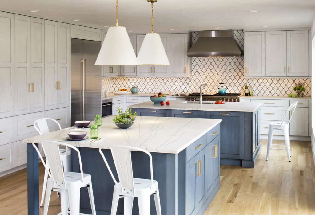 به عنوان مثال، کابینتهای سفید میتوانند با رنگ دیگری ترکیب شوند تا یک آشپزخانه دو رنگ ایجاد کنند. کابینتهای سفید به زیبایی با جزایر آشپزخانه آبی ترکیب میشوند و یک رنگ شاداب به فضا میبخشند.