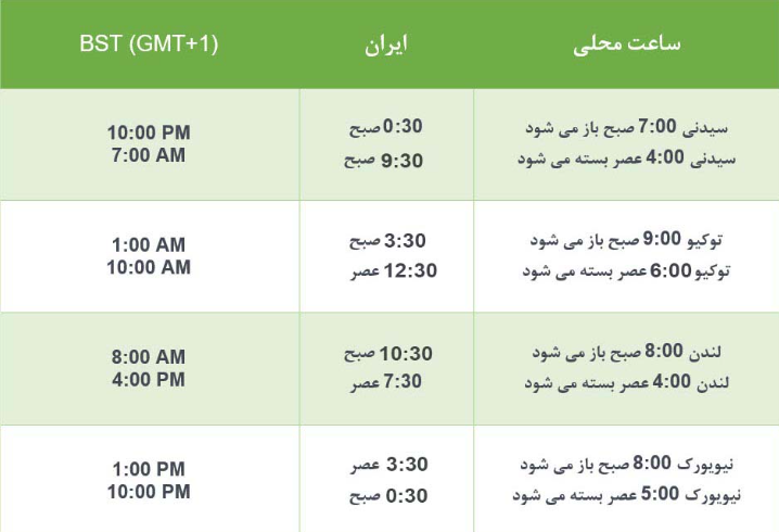فارکس (Forex) مخفف عبارت Foreign exchange market یا بازار تبادل ارزهای خارجی است؛ به عبارتی در بازار فارکس فرآیند تبدیل یک ارز به ارز دیگر انجام می شود. در فارکس همان طور که از نام آن پیداست، افراد فقط معامله انجام می دهند و سرمایه گذاری نمی کنند. در این بازار، ارزها در برابر یکد یگر به صورت جفت ارز معامله می شوند؛ به عنوان مثال، جفت ارز EUR/USD که در آن یورو در برابر دلار آمریکا قرار گرفته می شوند. معامله گران می تواند به راحتی در هر ساعتی از شبانه روز به این بازار دسترسی داشته باشند و به معامله گری در آن بپردازند. در واقع، بازار فارکس در 5 روزه هفته از بامداد دوشنبه تا بامداد شنبه به وقت ایران باز است. همچنین، بازار فارکس دارای 4 جلسه (session) معاملاتی اصلی است که به ترتیب جلسات سیدنی، ژاپن، لندن و نیویورک می باشند. ساعات باز و بسته شدن جلسات معاملاتی به شرح زیر است: