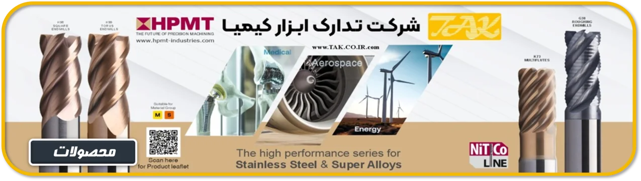 - HPMT : ابزارهای برشی با عملکرد پایدار و طول عمر بالا از جمله انواع فرز های انگشتی، مته های کارباید، فرز های کارباید، برقو های کارباید با دقت بالا و همینطور ساخت ابزار های مخصوص طبق دستورنقشه.